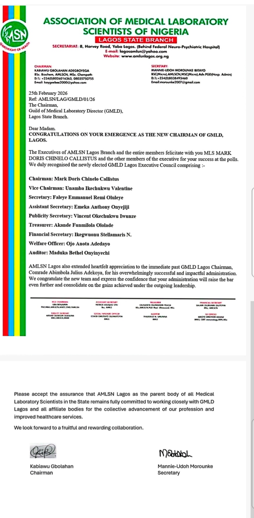 The Association of Medical Laboratory Scientists of Nigeria (AMLSN), Lagos State Branch led by, Comrade Kabiawu Gbolahan has congratulated the Lagos Branch of the Guild of Medical Laboratory Directors (GMLD) on the successful conduct of its 2026–2028 executive elections and swearing-in ceremony held on February 19 at the MLSCN South-West Zonal Office, Harvey Road, Yaba.